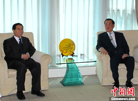 8月27日,河北文化宝岛行活动在台北正式启动,河北省委常委、宣传部长聂辰席率河北省文化代表团一行百余人将在台湾进行为期一周的文化交流及展演活动。图为中国国民党荣誉主席连战(右)在台北会见聂辰席(左)一行。中新社发路梅 摄