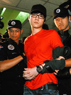 台中黑帮头目翁奇楠命案主嫌廖国豪昨天通过“立委”周守训安排投案,台中警方连夜北上押解,带回台中市警局侦讯。廖国豪面对媒体镜头显得疲惫,一语不发。 (图片来源:台湾《联合报》)