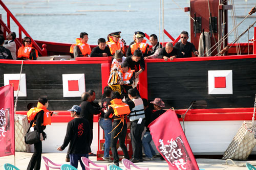 台湾首艘仿古打造的明郑时期商战两用船舰“台湾船”4日首航,从台南市安平渔港驶抵鹿耳门溪外海后,由市长许添财(中穿救生衣者)将郑成功神像抱下船。 图片来源:“中央社”
