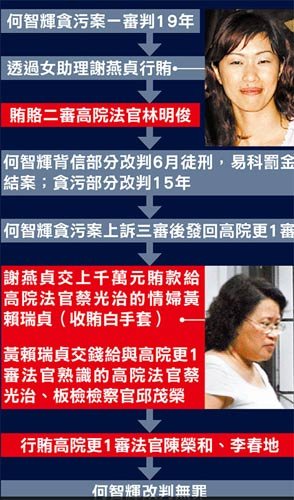 何智辉行贿法官,何的女友兼助理谢燕贞,充当援手。图片来源:台湾《苹果日报》