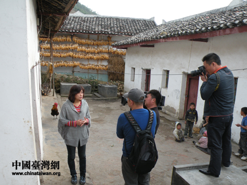 中央电视台记者采访正在越西县大营盘村走访村民的台胞张平宜(图片来源:四川省台办)