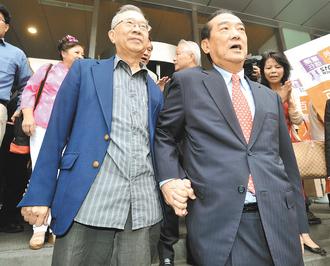亲民党参选人宋楚瑜(右)与副手林瑞雄(左)昨天上午前往“中选会”,完成被连署人登记,宋楚瑜紧紧抓住林瑞雄的手。
