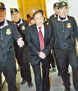 林瑞雄(中)昨在台北出席一项研讨会,致词结束后在随扈保护下接受媒体访问。
