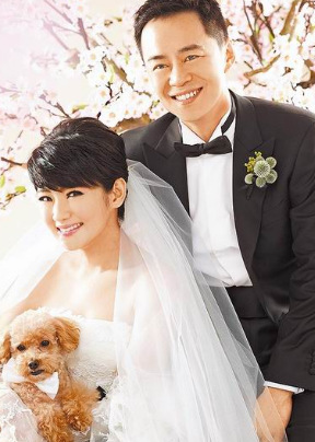 Selina(左)抱着爱犬,与张承中甜蜜拍婚纱照。图片来源:台湾“苹果日报”