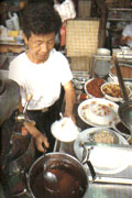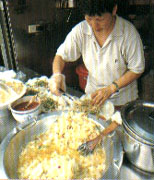 提到新竹小吃,马上令人联想到城隍庙。新竹城隍庙小吃在日据时代就已经成形,当时有“庶民味觉的殿堂”之称,时至今日,这里仍然是新竹小吃的大本营,范围涵盖了城隍庙和法莲寺前方的广场,与广场外围的东门街、中山路一带,约50家摊子搭棚架瓦,把古迹级的城隍庙团团围住,形成一个热闹的商区,其中不乏三代相传的知名老摊。 除了米粉、贡丸、肉圆三大新竹传统小吃齐聚于此,鲁肉饭、润饼、鱿鱼羹、蚵仔煎等亦别具滋味,工作卖力的摊主们从早餐卖到宵夜,24小时来这里都可以寻得美味,是新竹人吃三餐饱肚、游客品尝新竹美味的必到之地。 庙口林家肉圆 电话:(03)522-9008 营业时间:9点-24点 休息时间:每月最后一个周二 店内特色:香菇肉贡丸、葱肉肉圆、栗子肉圆、四神汤 正对城隍庙戏台的林家肉圆,为祖传三代的老店,以红糟肉、葱为馅料,裹上蕃薯粉、糯米合制的外皮,口味特殊,为新竹肉圆的正宗吃法。此外,用香菇、绞肉加蚝油、香料炒香后,再包进肉浆制成的香菇肉贡丸,也是林家独步的美食。而用小肠和薏米以文火煨透的四神汤,吃起来滑嫩不腻,洒上龙凤酒,味道更加香醇,是搭配肉圆的上选汤品。 林家甜品 电话:(03)523-0343 营业时间:09点半-21点半 休息时间:每月最后一个周二 店内特色:综合冰、红豆牛奶冰  这是城隍庙唯一卖冰品甜点的摊子,红豆绿豆、莲子桂圆、花生麦角等古味十足的传统配料,是让小摊屹立60多年的重要功臣。不同于一般煮得糊烂的冰点配料,林家阿伯把绿豆、麦角煮得恰好熟透、颗粒分明,吃起来口感香绵。因为客源稳定,冷热甜品都有,所以即便冬天前来,也不怕吃不到林家阿伯的“甜头”。 王记蚵仔煎 电话:(03)521-5625 营业时间:09点半-21点 休息时间:每月最后一个周二 店内特色:蚵仔煎、肉燕汤、鱼粳汤 采用每天清晨自嘉义东石运来的蚵仔,是王记蚵鲜味美的秘诀,而蚵仔煎要好吃,最重要的就是地瓜粉勾芡的功夫,粉水比例恰当,煎起来才会软中带Q,表皮香脆;另外,王记的肉燕也很特别,尤其是燕皮的制作费工,别处很难吃到;而汤鲜味美的鱼粳汤,亦是吃蚵仔煎的绝妙搭配。  元祖润饼 电话:(03)522-2285 营业时间:10点-21点半 休息时间:每月最后一个周二 店内特色:润饼 创店80多年、传承五代的郭家润饼,是新竹地区的润饼老店,因知名度颇高,故摊前常见大排长龙的盛况。其与众不同之处,在于用梨山高丽菜、红萝卜、白萝卜炒香后,卤制成口味独特的卤菜,加上蛋酥、菜脯、沙豆干、香菜、花生粉、豆芽等多种配料,再用香Q带劲的自制饼皮包起来卷上,既快速又好吃,无怪乎甚受大众喜爱。