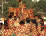 云林县广大的乡野,延续着不少民俗艺阵,其中褒忠乡大廍村的花鼓盛名远扬。随着“咚咚……”的鼓声,一群轻快活泼、身穿花布衣裳的妇女或转凉伞,或击花鼓,或敲打锣、钹,轻快地变换着队形,呈现出热情的活力,这是花鼓队的表演出场了。花鼓阵又名“大鼓花”、“鼓花阵”、“大鼓弄”或“翻鼓阵”,相传始于明郑时代,郑军退守台湾之后,实行屯田制度,士兵在农休时,温习武艺,众人则在一旁跳跃呐喊,击鼓助兴;入清以后,就改以花鼓的形式在民间流传下来,主要盛行于嘉南平原及高屏一带的农村,在庙会及农暇时演出迎神娱乐的俚艺。今日的花鼓阵,基本上需要头旗1人,鼓手1人,凉伞2人,锣鼓手各2人,也可增加人数,使阵容更加浩大。在头旗前导下,以大鼓为核心,队员们开步屈膝,铜锣围住大鼓边敲边扭,凉伞则旋转穿梭串场,整组人以两拍节奏和七步步伐变化队形,先拜旗、打圈,接着舞出跳四门、空穿、什花、蜈蚣阵、穿锣、开花、龙门阵、八卦阵、金玉满堂……等阵式,场内欢腾淋漓,场外叫好连连,为单调的农家生活增添欢娱的色彩。