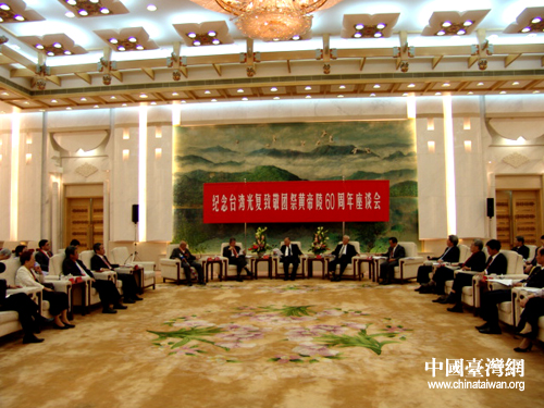 中国台湾网9月10日消息 “纪念台湾光复致敬团祭黄帝陵60周年座谈会”今天上午在北京人民大会堂台湾厅隆重举行。全国政协副主席、台盟中央名誉主席张克辉以及来自台湾的“原台湾光复致敬团后人谒黄帝陵团”全体团员出席了座谈会。张克辉表示,希望通过对六十年前那段历史的回顾,唤起我们更深的省思,共同面对两岸关系的前途和中华民族的未来。
