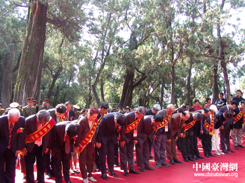 祭黄帝陵大典上,台“谒黄帝陵团”向黄帝陵行三鞠躬之礼。