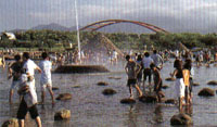 冬山河流域,曾是孕育养鸭人家的水园,但每雨成灾,使鸭赏的美味隐藏着多少辛酸;整治后的冬山河,呈显怡人的绿景,亲水公园中洋溢的蓬勃朝气,正是这条“希望之河”的最佳注脚。 源于新寮山的冬山河,纵贯冬山乡太和村至五结乡防潮闸间,绵延24公里长,是宜兰县第五大河,在兴兰阳溪汇流后注入太平洋。冬山河两岸早期为噶玛兰人居住地,噶玛兰人谙水性,生活与冬山河息息相关,后来汉人入住,原有聚落逐渐迁移或汉化,改变了冬山河一带的风貌,如今只有在流流社或加礼宛社,才能约略寻访到噶玛兰的足迹。 冬山河因河道弯曲,沿途又有多条支流汇入,因而每遇大雨便泛滥成灾。也正因此,冬山河流域一带耕作不易,居民以养鸭为生,居民划着鸭母船来回水面,是此区常见的情景,而为长久保存而制成的鸭赏,更是最能显现居民生活的食品。从1974年起,冬山河经过3年整治,筑成一条长达12公里的人工河,水位平稳、水流缓和,不仅解决了兰阳平原4000公顷低洼农田的严重水患,更因其四周景观丰富、规划良好,成为宜兰观光赏游胜地之一。 另外,冬山河游憩区地跨罗东、冬山、五结三乡镇,纳入主要开发计划的是从上游冬山河桥至下游利泽桥间长12公里的河道,为全台首创以运动、游憩、休闲功能作为规划的大范围河滨游憩区。主河道分上、中、下三段水域,展现不同的游憩风貌:上段以自然生态保育为主,中段辟为亲水活动区,而下段将建设成水上公园,整个冬山河游憩区俨然就是一深具休闲教育功能的“水态博物馆”。 上段冬山河桥畔建有可露营、烤肉的河滨公园,另设有赏月台、观星台可观察天体,并可细观小生物的活动,是一处生态丰富的自然场地。目前,宜兰县政府正着手将之规划为冬山河森林公园。中段由宜冬桥到捷径桥,长约3.5公里的河道平直宽广,是全程流域的精华地带;捷径桥附近的河滨地造了一座仿照大陆河北省赵县安济桥所建的仿古拱桥,古朴雅致,如卧波长虹,横跨冬山河之上。 过了捷径桥,便是著名的亲水公园,亲水公园为日本象集团所设计,以重建人与水的自然伦理为主要思想,模仿大自然造景并融入很多兰阳本土色彩,大至造景主轴线将水上舞台、五座圆锥形卵石丘及海面上的龟山岛,在视觉设计上连成一线,让这座宜兰地标引入亲水公园,而小至照明用的路灯,都以渔船聚鱼用的灯具为模型。此外,建筑素材多取自宜兰河床、海边的石材,或是手工烧制的红砖,处处显现了浓厚的宜兰乡土味。 亲水公园自1992年开放以来,早成为宜兰乡亲的休闲去处,其完善的亲水设施、清新的造景,与深富人文精神、感官之美的公共艺术,更吸引不少外地游客慕名前来,打响了名号。公园内见不到呼啸而过的汽车,倒是规划良好的单车道,引得不少人们踏着单车游园,悠缓的步调颇为惬意,这条单车道还可延伸至冬山火车站,在1小时的漫游中欣赏恬静的田园风光。 由昔日的灾患频频,到今日的游憩胜地,东山河的整治,亲水公园的辟建,让兰阳人深深引以为傲。现今,宜兰一年一度的端午龙舟赛都在东山河举行,风行国际的西式划船竞赛,国际童玩节也多利用此为活动场地,农历七夕还搭起鹊桥,凭添浪漫气氛。公园附近的河岸,因东山河的生态完好,每到晨昏便有不少钓客依着河岸抛竿,还不时可见竹筏梭巡水上,而下游的水上公园,将朝休闲消费的功能发展,提供滑水、钓鱼、观光渔猎等活动,作为全水域的水上游乐区。 涉水区 涉水区是公园里最热闹的地方,水深不过脚踝的设计,正是让大小朋友都能自在安心戏水的体贴,仔细观察,不难发觉池底有着跳房子用的格状图形;水中错落着白石与小型石墙,则意味着从前冬山河流域常见的鸭群与围篱。 童趣镶画 龙坡的阶梯上,是一方方有趣的镶嵌图画,这是800位宜兰小朋友用贝壳、弹珠、陶片所做成的水泥贴画杰作,鲜艳的色彩、随兴的构图,都使海洋世界、田园风光等贴画突显朴拙童趣。 划船区 划船区可用来练习龙舟、轻艇,等技巧练得纯熟后,再越过卧龙桥进入冬山河河道。水面架起的木栈桥,是小憩、赏景的好据点,而区隔划船区与冬山河河道的卧龙桥,则是仿龙舟造型设计而成,桥身两侧饰有放置船桨的圆孔。 文武凉亭 配合黄龙、青龙一文一武的意涵,河道两岸的凉亭也有不同的造型,象徵“文”的黄龙岸凉亭线条较圆滑,意指“武”的青龙岸则是有棱有角,刚柔并济,颇符合中国人的中庸之道。 野外剧场 半圆形的阶梯座席依坡层层缓降,是露天表演的最佳舞台,坐卧其上,看风景、欣赏表演两相宜。站在野外剧场的最高点往东望去,圆锥形的卵石丘由小渐大,排列成直线,再往远方延伸正是龟山岛的颈部,构成公园造景的主轴线。 乘车风向标: 自罗东车站搭往岳明的宜兴客运,于亲水公园下。