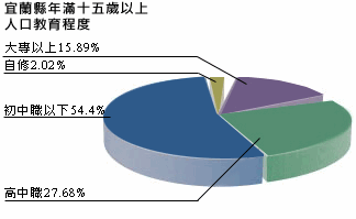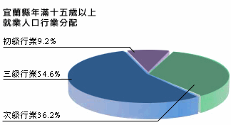 宜兰县人口数近47万人,满十五岁以上人口约37万人,其中教育程度状况,大专以上15.89%、高中职27.68%、初中职以下54.4%、自修2.02%;至于就业人口行业分配状况为初级行业9.2%、次级行业36.2%、三级行业54.6%,和全台的平均值初级行业7.8%、次级行业37.2%、三级行业55.0%,相当接近。