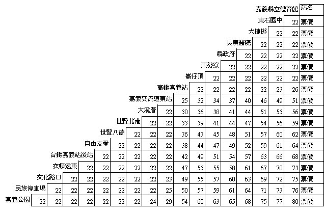 1、 嘉义公园(嘉义市家庭教育中心,嘉义市山子顶269-1号) 2、 民族停车场站(垂杨路民族停车场出口,台电对面) 3、 文化路口站(垂杨路和文化路交叉口,嘉义女中对面) 4、 衣蝶远东站(嘉义宪兵队前) 5、 台铁嘉义后站(中兴路1号) 6、 自由友爱站(自由路友爱大地,自由路294号) 7、 世贤八德站(世贤路一段648号) 8、 世贤北港站(雅哥汽车保养场) 9、 大溪厝站(50米道路9.2公里处) 10、嘉义交流道东站(50米8.3公里处) 11、高铁嘉义站(高铁站2出口旁) 12、仑仔顶站(县168道17.3公里处) 13、东势寮站(东势小区入口处) 14、县政府站(县168道15.3公里处) 15、长庚医院站(长庚医院候车亭) 16、大槺榔站(县168道12公里处) 17、东石初中站(朴子艺术公园) 18、嘉义县立体育馆站