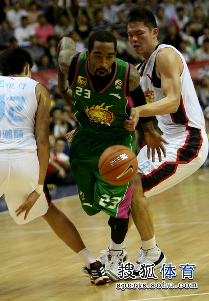 北京时间11月20日晚,2011-12新赛季CBA首轮继续进行。在东莞体育馆进行的较量中,主场作战的卫冕冠军广东东莞银行男篮经过四节争 夺以111-78战胜浙江稠州银行,喜获新赛季开门红。图为JR-史密斯突破包夹