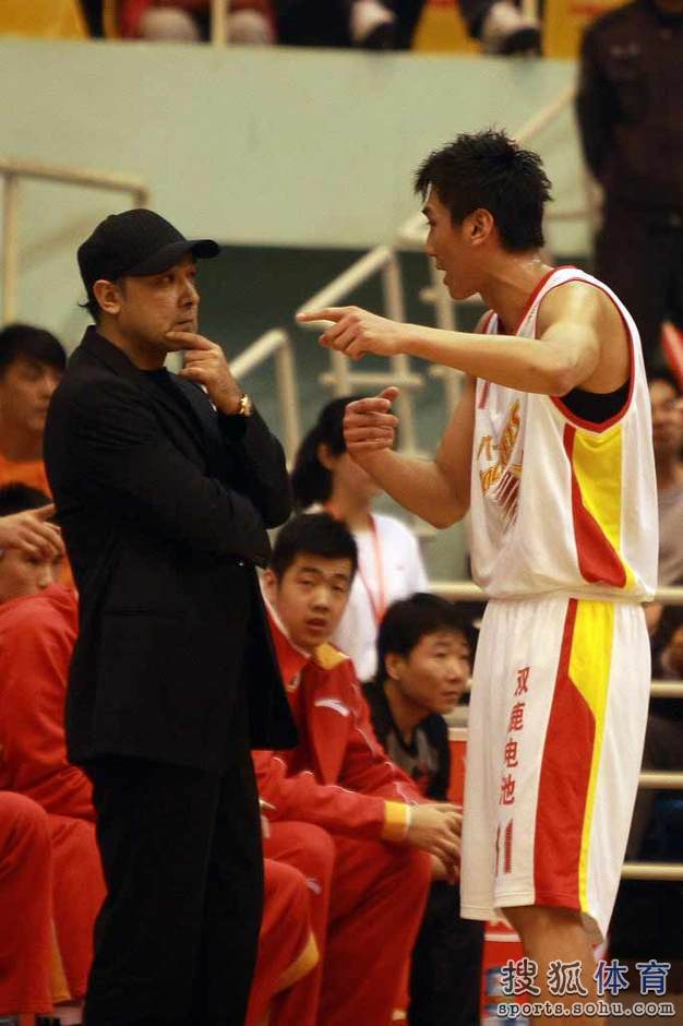 北京时间11月20日,CBA常规赛第一轮八一对战东莞新世纪,图为与教练沟通。