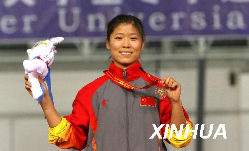 2月24日,中国选手董飞飞在颁奖仪式上展示金牌。当日,在第24届世界大学生冬季运动会速度滑冰女子5000米决赛中,董飞飞以7分19秒76的成绩获得冠军。