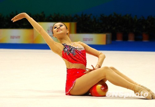 10月20日,中国第十一届全国运动会进入第四天的比赛。全运赛场热火朝天,如火如荼。各路健儿各展英姿,奉献了一场场竞技好戏。图为十九日晚于山东德州体育中心体育馆举行的十一运会艺术体操个人全能比赛中,广西队的邓森悦艺压群雄,获得了十一运会艺术体操个人全能冠军。中新社发 尹传伟 摄