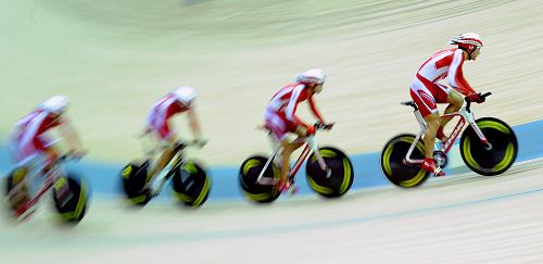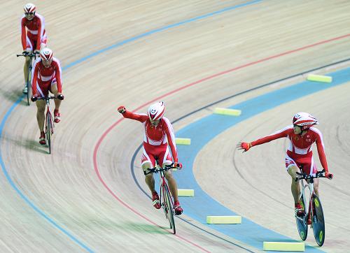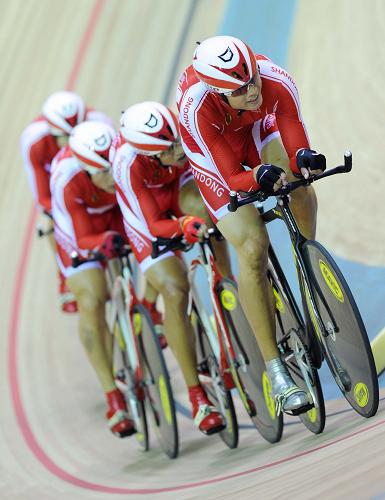 10月20日,山东队队员在比赛中。当日,在第十一届全国运动会自行车男子场地团体追逐赛决赛中,山东队以4分07秒507的成绩夺得冠军。