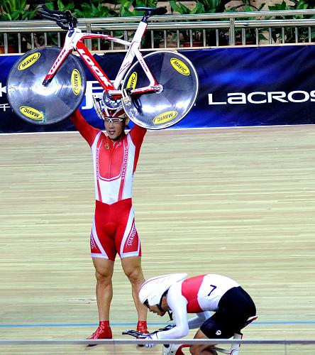 10月20日,山东队队员李传民举起自行车庆祝胜利。当日,在第十一届全国运动会自行车男子场地团体追逐赛决赛中,山东队以4分07秒507的成绩夺得冠军。