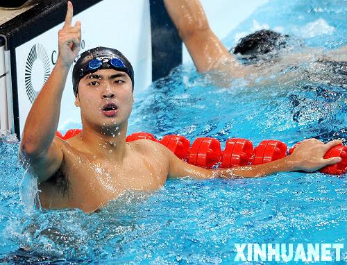 10月20日,浙江选手吴鹏在获胜后庆祝。当日,在第十一届全运会游泳比赛男子200米蝶泳决赛中,浙江选手吴鹏以1分54秒40的成绩获得冠军。新华社记者李钢摄