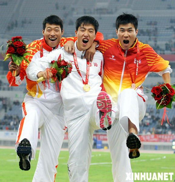 10月25日,刘翔(中)、纪伟(左)和史冬鹏在领奖台上。当日,在第十一届全运会田径男子110米栏决赛中,上海队选手刘翔以13秒34的成绩夺得冠军,解放军队选手纪伟和河北队选手史冬鹏分获二、三名新华社记者范长国摄