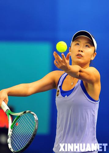 10月21日,天津队选手彭帅在比赛中发球。当日,在第十一届全国运动会网球女单第二轮比赛中,彭帅以2比0战胜北京队选手赵依婧,晋级下一轮。新华社记者王雷摄