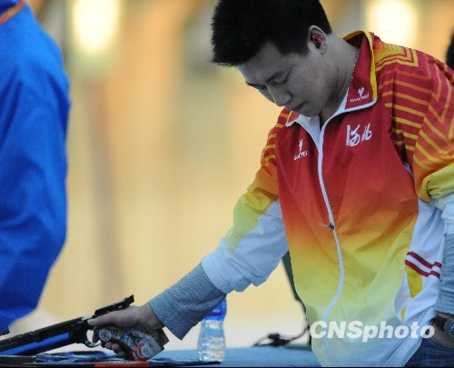 2009年10月20日,山东济南,09全运会射击男子10米气手枪预赛,奥运冠军庞伟遭淘汰,和妻子杜丽一样,庞伟也遭到了媒体围攻。 中新社发 吴俊 摄