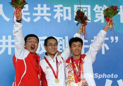 10月20日,在第11届全运会男子10米气手枪决赛中,上海小将麦嘉杰(中)力压老枪谭宗亮,以总成绩687.9环夺得冠军。山东队的谭宗亮(左)和内蒙古队的韩庆洲(右)分获2、3名。 中新社发 汤彦俊 摄