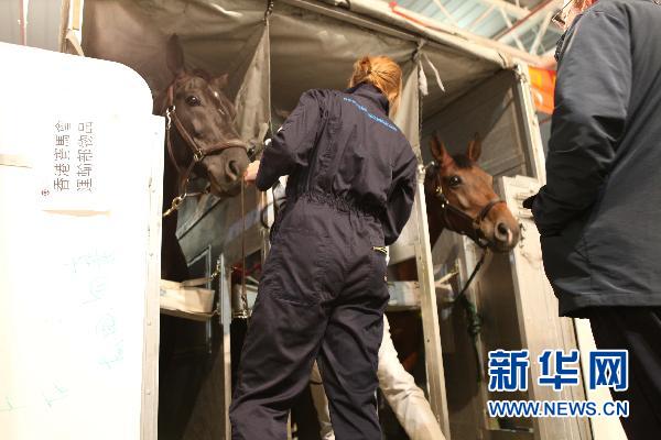 11月4日,工作人员将赛马从集装箱里牵出。当日,参加广州亚运会马术比赛的首批马匹于凌晨抵达广州白云国际机场。首批马匹来自韩国。新华社发(张瑞摄)
