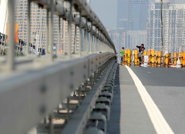 11月11日,工作人员在猎德大桥上安装烟花。据亚运烟花燃放总指挥部副总指挥、熊猫烟花集团董事长赵伟平介绍,即将在12日举行的第16届亚运会开幕式上,将会燃放16万发烟花。此次燃放的烟花共分为3个主题,燃放点位覆盖“水陆空”。其中不少燃放点位彼此之间相隔数公里,但是借助高科技燃放技术,烟花都能同时起爆,并按照预设的燃放路径飞抵相同的高度。新华社记者公磊摄