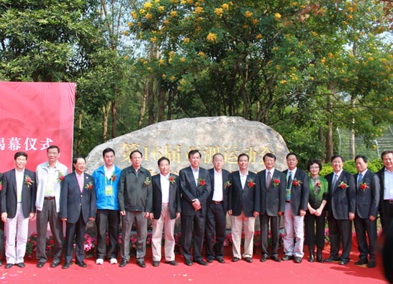 10时55分,伴随着绚烂的礼花纷飞,2010年第16届亚运会高尔夫竞赛及训练场馆正式揭幕。袁伟民、蔡振华、林木声等共同为亚运球场纪念石揭幕,并与在场嘉宾合影留念。十余家电视、报纸、杂志、网络媒体来到现场报道揭幕仪式盛况,见证了这一重要的历史时刻。