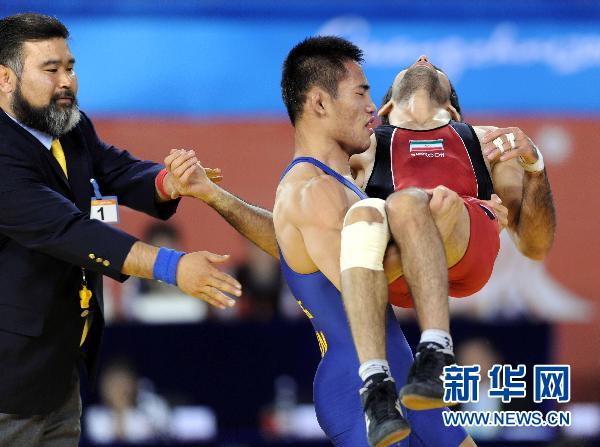 11月23日,中国选手高峰(中)抱起受伤的伊朗选手赛义德 艾哈迈迪 扎林科拉伊离场。当日,在第16届亚运会摔跤男子自由式60公斤级铜牌赛中,伊朗选手赛义德 艾哈迈迪 扎林科拉伊腿部受伤,坚持完成了比赛,比赛结束后,场上的对手高峰把他抱下了赛场,展示了友谊的力量。高峰以3比1战胜赛义德 艾哈迈迪 扎林科拉伊,获得铜牌。新华社记者杨宗友摄