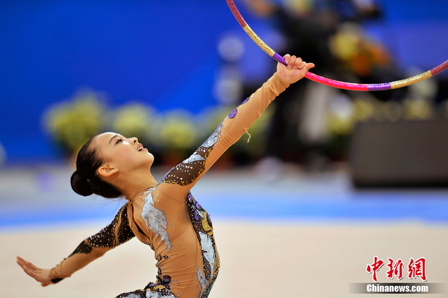 萝莉,英文名为LOLI,本意指12岁以下的小女孩,后泛指天真可爱的小女生。15岁的韩国艺术体操选手孙妍在,凭借着修长的身材、姣好的面容,以及明亮的眼眸,一直被人称为“艺术体操届的金妍儿”。堪称广州亚运会“小萝莉”中的NO.1。图为孙妍在在亚运艺术体操比赛首日的精彩表现。中新网记者 金硕 摄