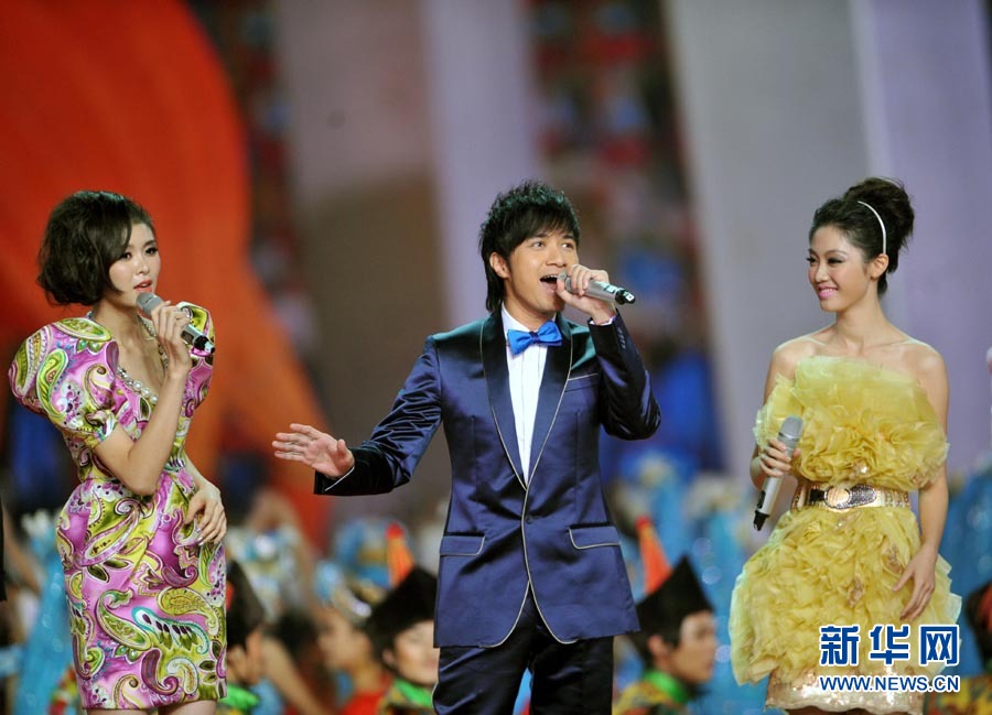 11月27日,第16届亚运会在广州市海心沙岛举行闭幕式。这是古巨基(中)等歌手在演唱歌曲《凯旋》。 新华社记者刘大伟摄