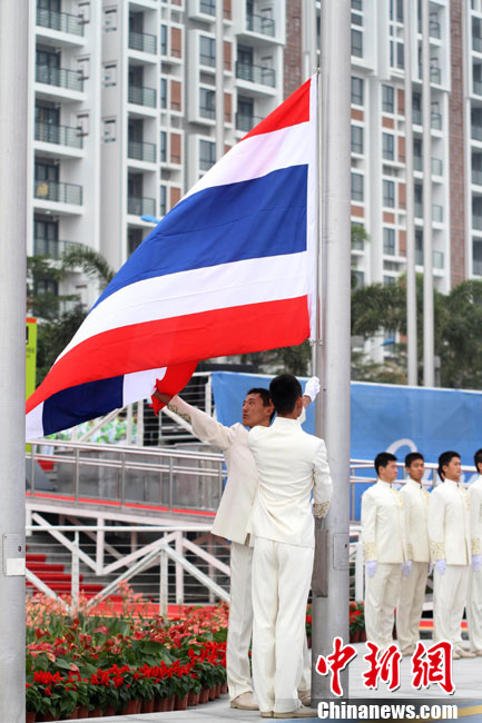 12月11日上午,参加亚残运会的泰国代表团在广州亚运城升旗广场举行升旗仪式。 中新社发 张美安 摄