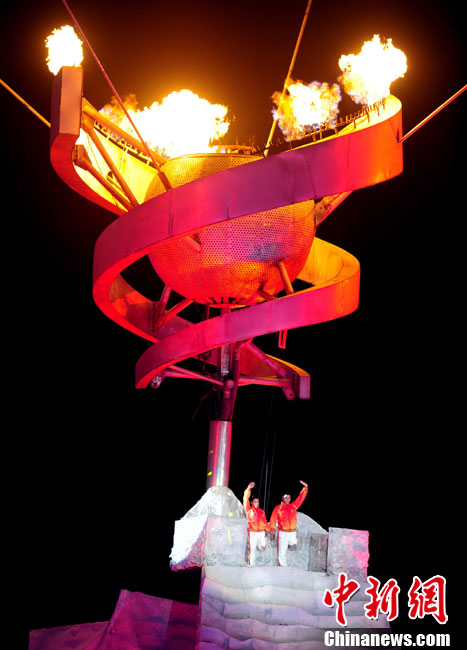 12月12日晚,广州2010年亚残运会开幕式在奥体中心开幕,羊城洋溢生命之光,主火炬点燃由两名残疾人火炬手攀登接力点燃。中新社记者 陈文 摄