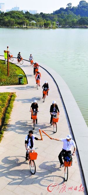 昨天下午,由广州日报《佛山新闻》与佛山桂城街道联合主办的“一起来,桂城更精彩”低碳出行活动在千灯湖举行。200多名从广州“近道而来”的市民及桂城形象代言人、“美在花城”冠军赵荣一同骑单车畅游了南海地标千灯湖。昨天的活动还加入了“火炬传递”元素,所有完成环湖一周骑行的市民均可获得一个特制的简易火炬。