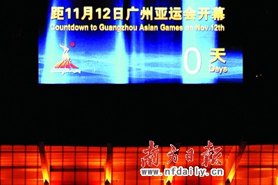 昨晚8时整,羊城所有亚运倒计时牌全部显示“0”,意味着广州亚运会正式到来。在英雄广场、白云宾馆及各地铁站的亚运倒计时牌前,许多市民纷纷拍照以留下这一历史时刻。图为位于天河体育中心的亚运倒计时牌。南方日报记者王辉卢慧明姚艺曲摄影报道