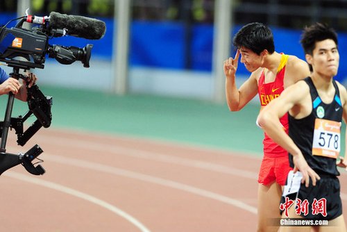 11月22日,广州亚运会田径赛场,男子110米栏的预赛,中国著名运动员刘翔(微博官网博客)登场亮相,以13秒48的成绩晋级决赛。中新社记者 陈文 摄