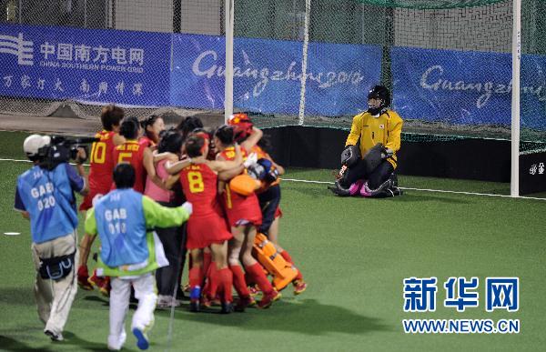 11月24日,韩国队1号守门员文英姬在比赛结束后跪倒在地目视中国队员庆祝胜利。当日,在第16届亚运会曲棍球女子冠亚军决赛中,中国队通过点球大战,以5:4战胜韩国队,夺得冠军。新华社记者杨磊摄