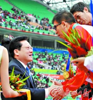 张广宁为田径男子跳远F11级比赛获奖运动员颁发奖牌,中国选手李端夺金。