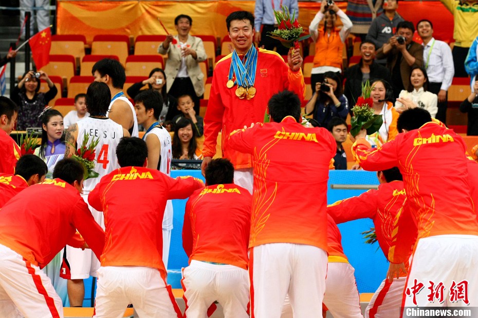 11月26日晚,2010亚运会男篮决赛,中国队77-71战胜韩国夺冠。图为中国队队员向王治郅鞠躬致意。中新社记者 富田 摄