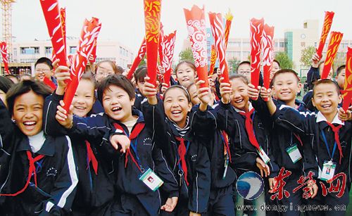 “加油,亚运!加油,中国!”10月11日,山东省东营市东营区一中学生正在展示自己制作的亚运会火炬。10月9日,广州亚运会圣火在长城点燃,激起了东营市30万学子的爱国之情,师生通过制作火炬、模拟传递、绘画竞赛、搜集亚运知识等形式表达激动心情。 (刘智峰 黄金涛 )