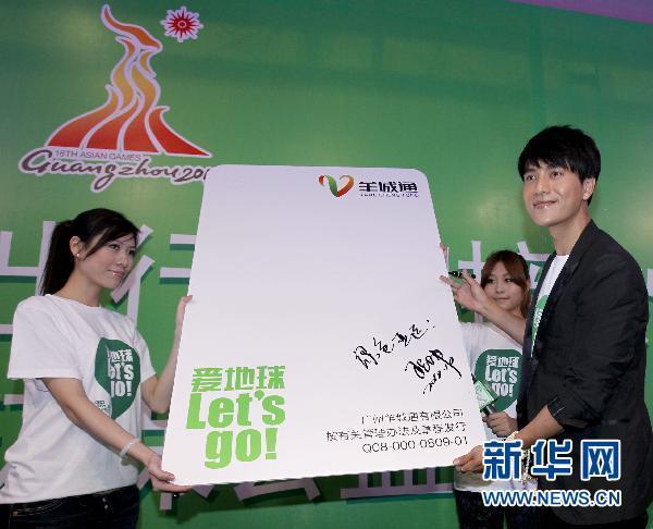 10月17日,著名演员陈坤(右)在亚运绿色出行羊城通低碳卡模拟版上签名。当日,“畅享绿色出行,迎接激情亚运”启动仪式在广州举行,著名演员陈坤被正式聘请担任“亚运绿色出行大使”。“绿色出行”系列活动是中国民促会绿色出行基金发起的公益低碳环保项目,借助于大型赛会与活动的契机推广绿色出行方式,提倡低碳生活理念。新华社记者陈建力摄