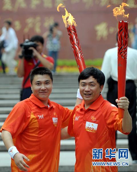 10月18日,第一棒火炬手、射击运动员刘刚(左)与第二棒火炬手谢昌晶在交接后合影。当日,第16届亚洲运动会火炬传递活动在深圳市举行,80名火炬手在8公里的路线上进行传递。新华社记者刘大伟摄