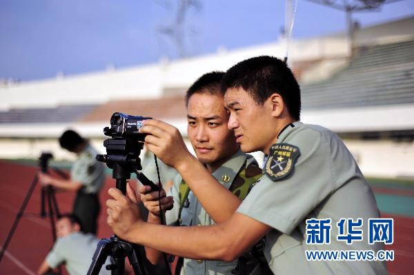 10月21日,负责亚运安保无线宽带数据保障的广州军区某通信团官兵在广州花都体育场进行WiFi无线通信单兵终端实战演练。该设备将在广州亚运会、亚残运会各场馆安保及处理重大突发事件中担负重要任务。WiFi无线通信单兵终端依靠单兵携行,可深入大型装备无法进入的复杂地域执行任务,并能迅速传输高速移动宽带、高质画面及文电通信。该装备先后在汶川地震、玉树地震和上海世博会中发挥了突出作用。新华社记者陈晔华摄