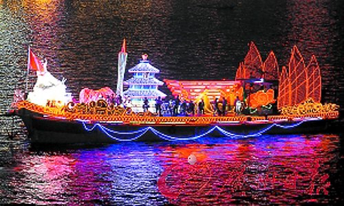花船巡游是广州亚运会开幕式的一大创举。每艘花船都经过精心的设计与装扮,以亚洲各个国家和地区最具特色的名胜古迹为原型的造型成为花船的“身份标志”。45艘花船,45支队伍,各有各的精彩。