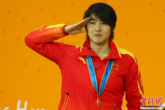 11月15日,在广州亚运会女子200米蝶泳项目中,中国选手焦刘洋以2分05秒79封后。图为焦刘洋在领奖的时候行军礼。