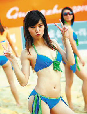 火辣宝贝成赛场一景,近日,第十六届亚运会沙滩排球比赛在亚运城沙排场进行,一群青春靓丽的沙排宝贝为比赛增色不少。但也有一些参赛国家的运动员抱怨,沙排宝贝热辣的着装和动作让他们在比赛中不可能集中注意力。