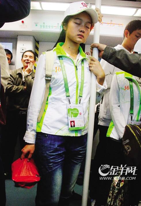 娇弱身躯,稚嫩面庞,地铁里站着倚杆睡着了,一脸倦累,手中还拎着个盒饭。衣服和胸牌显示了她的身份:广州亚运志愿者。这一幕,被有心人拍了下来,挂上网。她迅速蹿红,并被称为“最美的‘亚运妹妹’”。