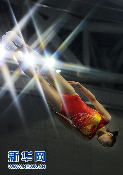 11月21日,中国选手何雯娜在比赛中。当日,在第16届亚运会蹦床女子个人资格赛中,何雯娜获得71.80分的成绩名列预赛第一,晋级决赛。新华社记者王雷摄