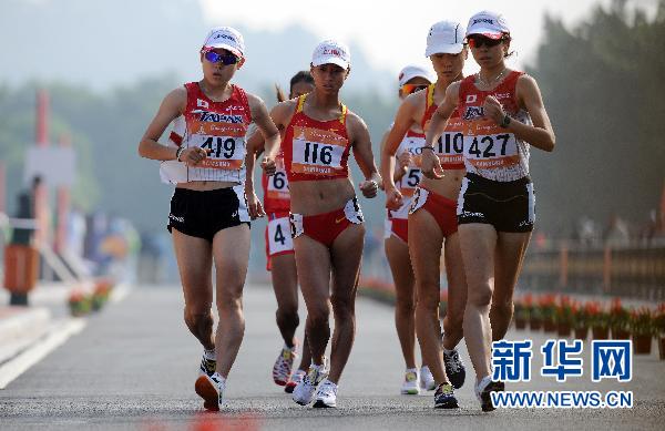 11月23日,中国选手刘虹(左二)在比赛中。当日,在第16届亚运会女子20公里竞走比赛中,刘虹以1小时30分06秒的成绩夺冠。新华社记者吕小炜摄